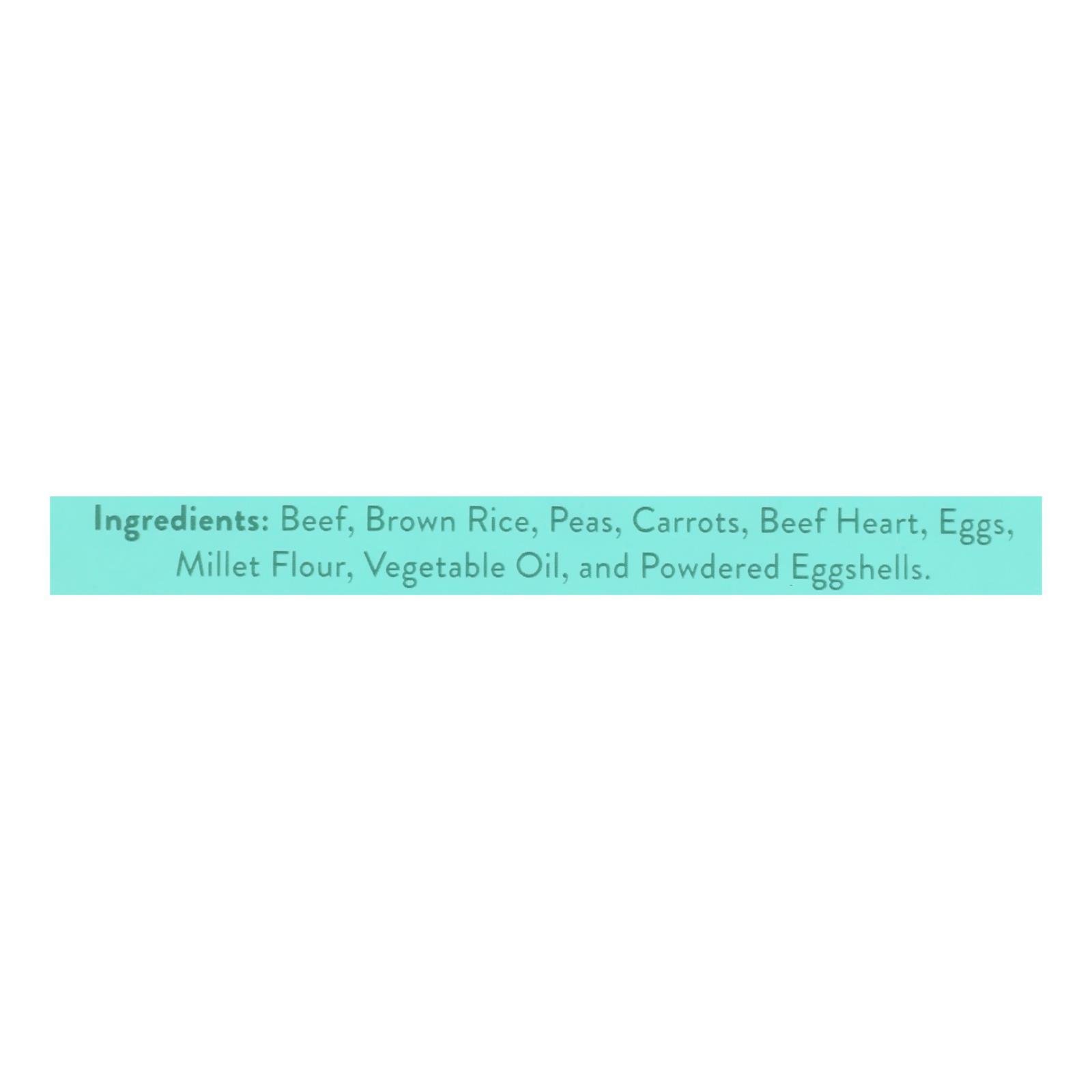 BEEF;BROWN RICE;PEAS;CARROTS;BEEF HEART;EGGS;MILLET FLOUR;VEGETABLE OIL;AND POWDERED EGGSHELLS