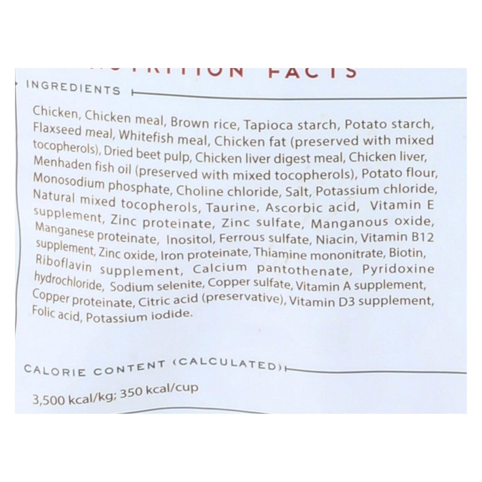 Ingredients: CHICKEN;CHICKEN MEAL;BROWN RICE;TAPIOCA STARCH;POTATO STARCH;FLAXSEED MEAL;WHITEFISH MEAL;CHICKEN FAT (PRESERVED WITH MIXED TOCOPHEROLS);DRIED BEET PULP;CHICKEN LIVER;NATURAL FLAVORS;MENHADEN FISH OIL (PRESERVED WITH MIXED TOCOPHEROLS);POTATO FLOUR;CHOLINE CHLORIDE;SALT;POTASSIUM CHLORIDE;MIXED TOCOPHEROLS (PRESERVATIVE);MONOSODIUM PHOSPHATE;TAURINE;ASCORBIC ACID;VITAMIN E SUPPLEMENT;ZINC PROTEINATE;ZINC SULFATE;MANGANOUS OXIDE;MANGANESE PROTEINATE;INOSITOL;FERROUS SULFATE;NIACIN;VITAMIN B12 SUP